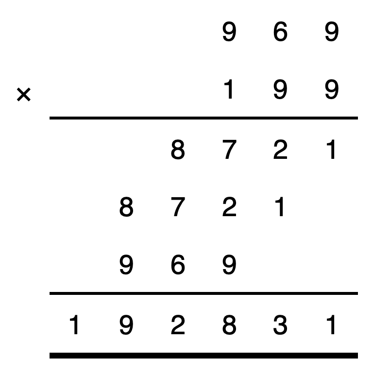 #! python3 -m enigma -rr SubstitutedExpression # E T E # x y z # ----------- # a b 2 1 # J U I N # c d e # ----------- # f g 2 h i 1 --literal="12" --distinct="EIJNTU" "{ETE} * {xyz} = {fg2hi1}" "{ETE} * {z} = {ab21}" "{ETE} * {y} = {JUIN}" "{ETE} * {x} = {cde}" --answer="({ETE}, {xyz})" --output="lambda p, s, ans: output_mul(*ans, pre=' ', start='', end='')"Solution: The reconstructed sum is: 969 × 199 = 192831.